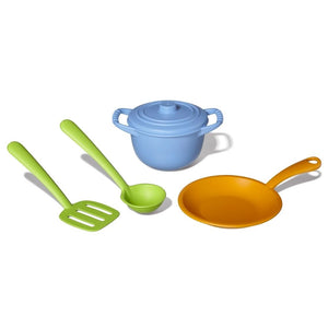 The Cooking Utensils set includes frying pan, pot with lid, saucepan, spatula, and turner. Set includes a frying pan, pot with lid, saucepan, spat...