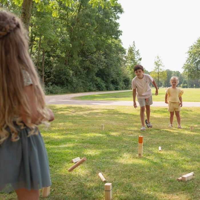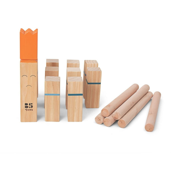 Contains playing instructions, a 24cm high wooden king pin, 10 wooden knock-down kubbs (12cm high), 4 wooden throwing batons and 4 play zone marker pins. For 2-6 players aged from 8 years. Made from solid timber for extra durability.