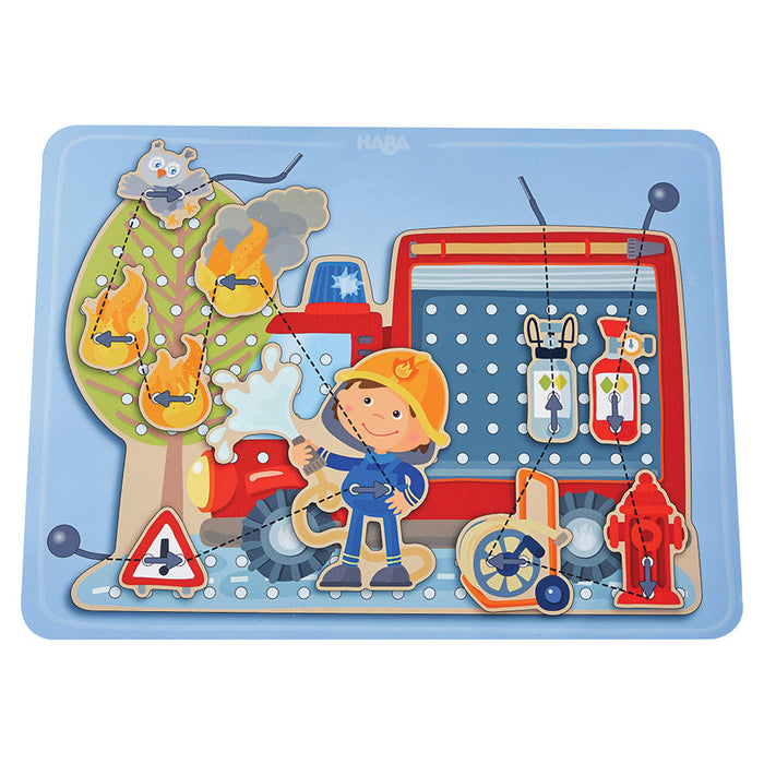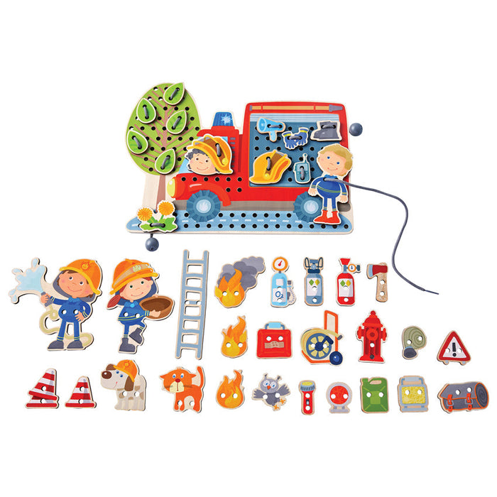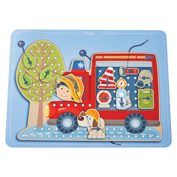 Children will love the challenge of threading 38 fire-themed tiles across a colourful fire truck play board. Choose one of the two double-sided template cards to copy or let kids design their own daring fire rescue. Pieces attach safely to the play board using two strong laces, making every play session a chance for a new adventure.