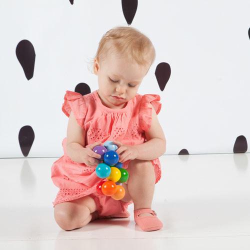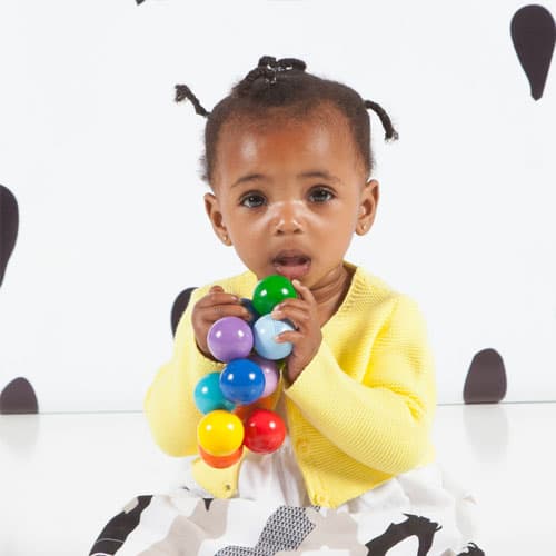 The Manhattan Toy Company Classic Baby Beads are made with large wooden beads strung together on tough elastic cord. Manipulate the beads into endless configurations. It's a beautifully sensory toy that's great for stimulating baby.